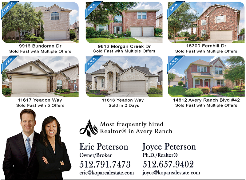 “Kopa Real Estate did an amazing job of marketing my home in Avery Ranch. If you are thinking about buying or selling in Avery, don't spend anymore time looking--call Eric. Unlike some other realtors I've worked with in the past, they understand how to market a house. While other homes are still for sale that were put up before mine, mine sold in days with 5 offers. They know how to create demand. HIGHLY recommend Kopa Real Estate. ” - Paul